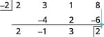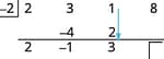 The division is complete. The numbers in the third row give us the result. The $2 \ -1 \ 3$ are the coefficients of the quotient. The quotient is $2x^{2}−1x+3$. The $2$ in the box in the third row is the remainder.