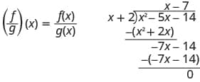 | Substitute for $f(x)$ and $g(x)$. | $\left( \frac{f}{g} \right)(x)= \frac{x^{2}-5x-14}{x+2}$ |
