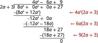 Written this way, we can see that $4a^{2}−6a+9$ and $2a+3$ are factors of $8a^{3}+27$. When we did the division, the remainder was zero.