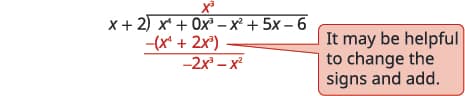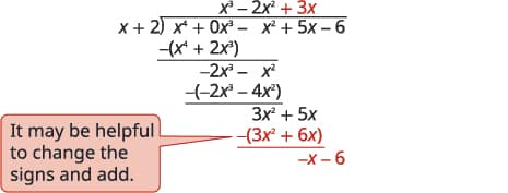 Look back at the dividends in previous examples. The terms were written in descending order of degrees, and there were no missing degrees. The dividend in this example will be $x^{4}−x^{2}+5x−6$. It is missing an $x^{3}$ term. We will add in $0x^{3}$ as a placeholder.