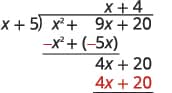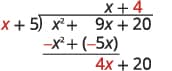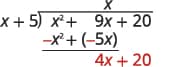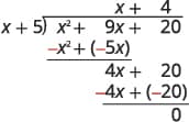 | Subtract $x^{2}+5x$ from $x^{2}+9x$. You may find it easier to change the signs and then add. Then bring down the last term, $20$. | ![]() |