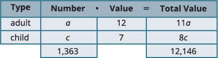 | The Number column and Total value column give us the system of equations. | $\Bigg\{ \begin{align*} a+c&=1,363 \\12a+7c&=12,146 \end{align*}$ |