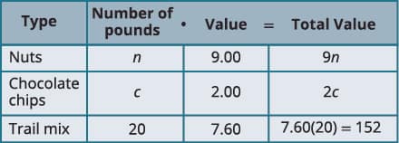 | Step 3. Name what we are looking for. | Let $n=$ the number of pounds of nuts and $c=$ the number of pounds of chocolate chips. |