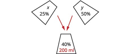 | Step 1. Read the problem. A figure may help us visualize the situation, then we will create a table to organize the information. | Sasheena must mix some of the $25\%$ solution and some of the $50\%$ solution together to get $200$ ml of the $40\%$ solution. |