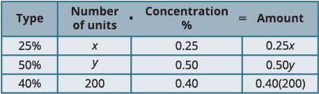 | A table will help us organize the data. She will mix $x$ ml of $25\%$ with y ml of $50\%$ to get $200$ ml of $40\%$ solution. We write the percents as decimals in the chart. We multiply the number of units times the concentration to get the total amount of sulfuric acid in each solution. | ![]() |