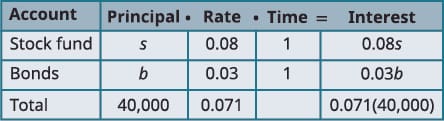 | Step 4. Translate into a system of equations. We get our system of equations from the Principal column and the Interest column. | $\Bigg\{ \begin{align*} s+b&=40,000 \\ 0.08s+0.03b&=0.071(40,000) \end{align*}$ |