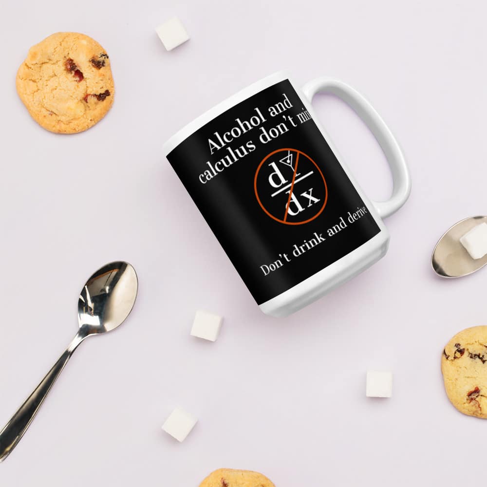 Alcohol and calculus don’t mix… don’t drink and derive mug. Whether you’re drinking your morning coffee, evening tea, or something in between – this mug’s for you! It’s sturdy and glossy with a vivid print that’ll withstand the microwave and dishwasher.