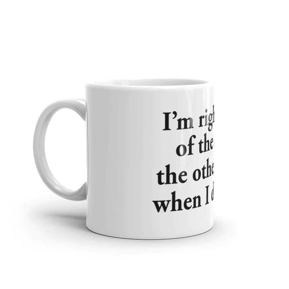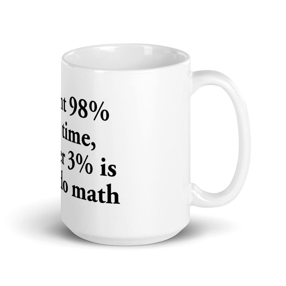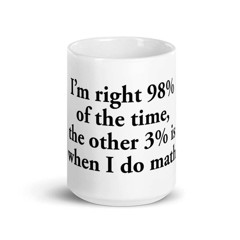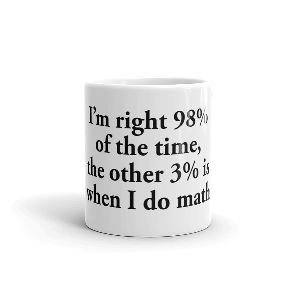 I’m right 98% of the time, the other 3% is when I do math mug. Whether you’re drinking your morning coffee, evening tea, or something in between—this mug’s for you! It’s sturdy and glossy with a vivid print that’ll withstand the microwave and dishwasher.
