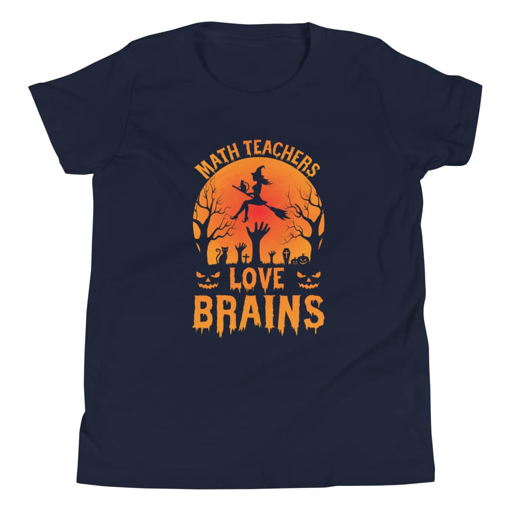 Picture yourself wearing this shirt, featuring a captivating design that showcases a chalkboard filled with equations and a playfully eerie zombie hand reaching for a brain-shaped pi symbol. It’s not just a t-shirt; it’s a conversation starter and a source of laughter. Imagine sharing math-related jokes like, “Why was the math book sad on Halloween? Because it had too many problems!” or “Why do mathematicians always carry a pencil on Halloween? In case they need to draw bloodlines!” This youth short sleeve t-shirt is the perfect addition to your math-tastic wardrobe, ensuring you’ll have a howling good time while celebrating the intersection of math and mischief. So, grab your “Math Teachers Love Brains” t-shirt and get ready to multiply the fun on Halloween night!