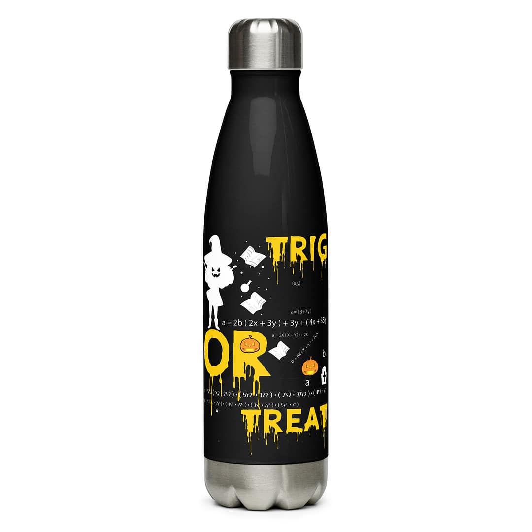 Elevate your daily hydration game with our Trig or Treat stainless steel water bottle! Whether you’re a math aficionado or simply enjoy a good pun, this water bottle is the perfect addition to your daily routine. Featuring a playful design of a smiling jack-o’-lantern holding a protractor and a candy-filled trigonometric equation, this bottle adds a touch of mathematical whimsy to your day with every sip. It’s a fun and lighthearted way to combine your love for math with a hint of Halloween spirit. So, this October and beyond, stay refreshed and keep your mathematical wit on display with our Trig or Treat water bottle.