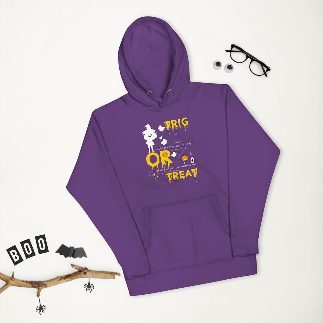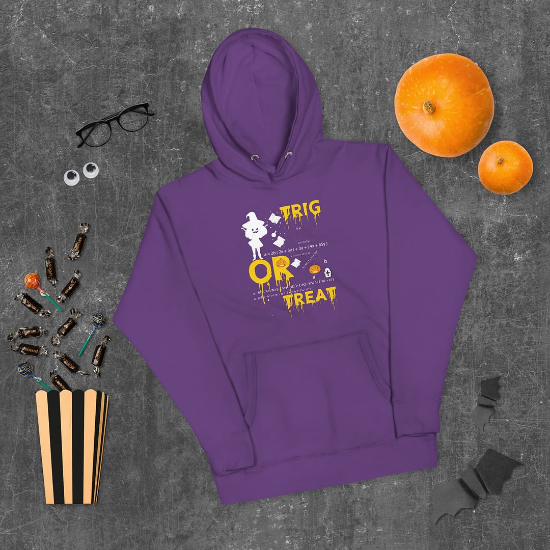Get ready to spookify your math class this Halloween with our Trig or Treat hoodie! Whether you’re a math enthusiast or just love a good pun, this hoodie is the perfect addition to your festive wardrobe. Featuring a playful design of a jack-o’-lantern holding a protractor and a candy-filled trigonometric equation, this hoodie is sure to make everyone smile. It’s a fun and lighthearted way to combine your love for math with the spirit of Halloween. So, this October 31st, don’t just go trick-or-treating, go Trig or Treating and add some mathematical magic to your Halloween festivities!